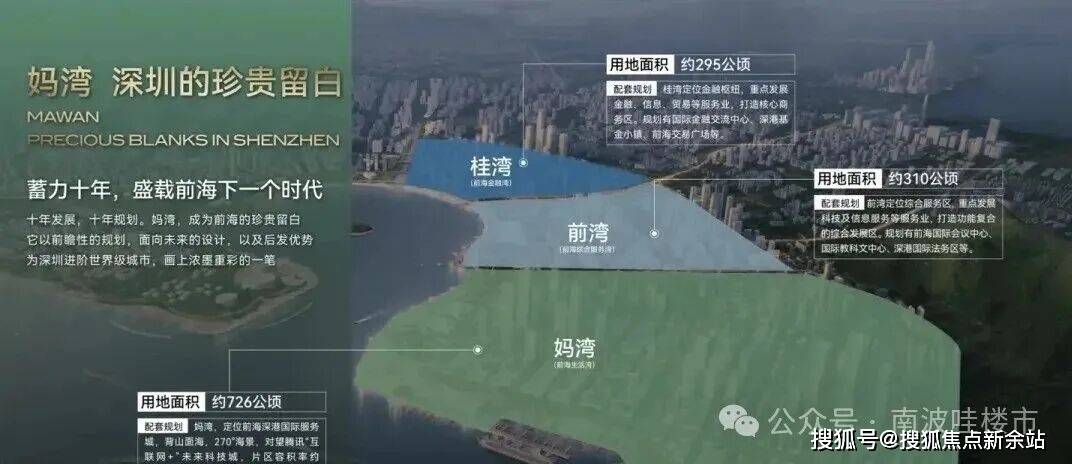 根据规划,妈湾有2.9平方公里的土地由招商局集团和前海管理局合资成立的公司统一开发运营,最新定位是前海深港国际服务城,与桂湾深港国际金融城共同组成了前海双核,是前海扩区后的首要、重点推进项目。